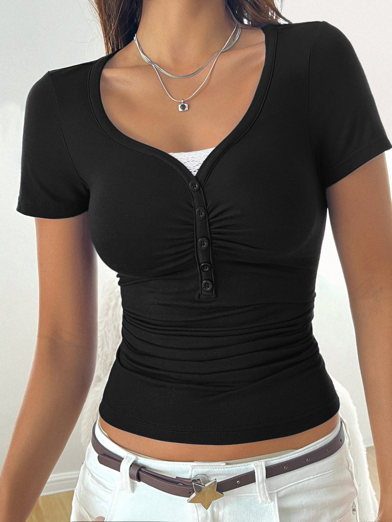 Solid Color Slim Lace Stitching V-neck Short Sleeve Top